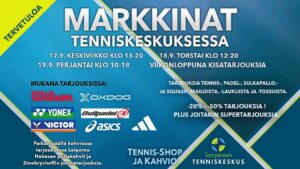 Tampereen Tenniskeskuksella Pro Shopin ja kahvion markkinat 17.9. – 19.9.2025! Markkinahulinat käynnissä: ke 17.9. klo 15-20 to 18.9. klo 12-20 pe 19.9. klo 10-18