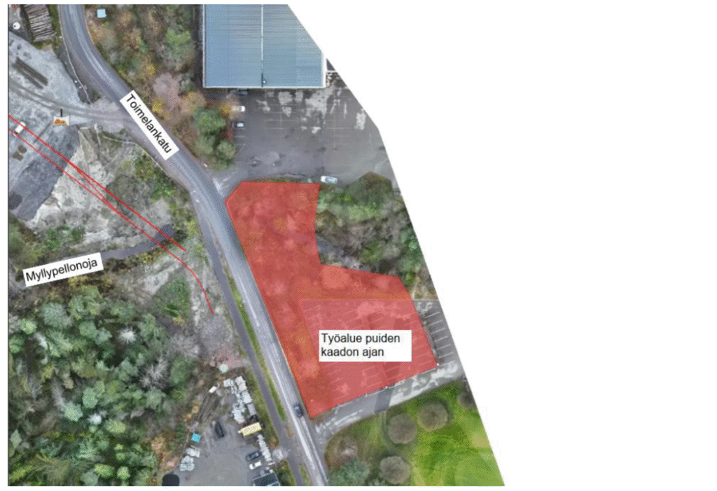 Tiedote: Tulevan talvikauden töiden valmistelut aloitetaan marraskuun aikana Toimelankadulla, kun teemme puiden kaatoja Tammer-Golfin ja Tenniskeskuksen Toimelankadun puoleisten parkkipaikkojen välissä, kuvan osoittamassa kohdassa.
