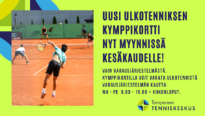 Tenniskeskuksen ulkotenniskaudelle 2026 on tullut myyntiin myös ulkotenniksen sähköinen kymppikortti. Kortilla voit varata yhteensä 10h ulkotennistä. Kortti käy arkisin klo 8.00-15.00 ja viikonloppuisin, sen hinta